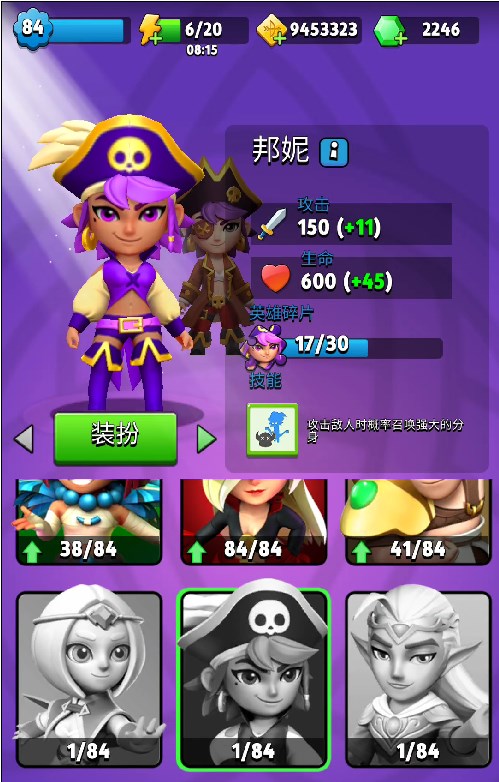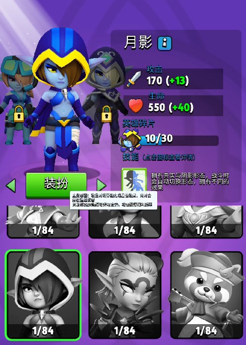 如果说上述的两个角色还可以通过平时做活动肝到碎片的话,那么这个角色的养成就需要完全的氪金,碎片方面非常难以获取,从目前而言,几个活动中很难拿到他的碎片,不知道之后官方会不会出新活动,给出更多的碎片获取手段。随着获取难度的提升,其伤害却是游戏中的顶级,基础面板方面,170攻击550生命,是一个暗影的输出类型角色,再配合技能打出非常高的单体输出。
