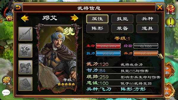 贾诩的属性其实也是一般般,不过是0元党的福音,军师技可以增加招降概率!清兵技能没有什么卵用,不过火雷5发如果能中3发,一般就能打掉一半血了!大招可以大片固定减血中毒,也算好用吧!