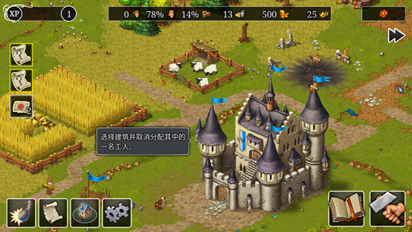 游戏的主界面简洁明了,顶部显示人力、物资等关键信息,右上角可以切换季节和游戏速度。城市管理功能齐全,包括任务、资源、人口、科技等模块。建筑是核心玩法,城堡作为起点,玩家可以通过建造各种设施提升城市的繁荣度。此外,游戏还支持语言切换,方便不同地区的玩家使用。