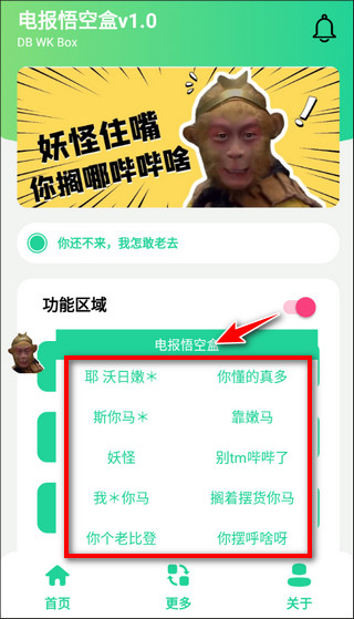 电报悟空盒又火了啦,都怪猴哥的迷人嗓音太有魅力,时至今日人们还在用悟空骂人的表情包语音包来发泄自己~这是一款在游戏或钉钉视频中特别有效的语音包软件,最新的电报猴语音(未消音版含妈量巨大)保证能让你和你的小伙伴们惊得不敢说话!小编部门在听过之后也不得不感叹:只有真花果山电报猴才能说出如此鬼畜魔性的语录!各种优美的孙悟空语音,搭配最新最火的潮流网络语录,通通播放出来,让游戏里那些又菜又爱玩的队友们领略一番吧!开黑的时候也可以悄悄打开队友麦克风,活跃队内气氛,整蛊你最铁的哥们~喜欢孙悟空骂人语音的朋友可以下载试试。
