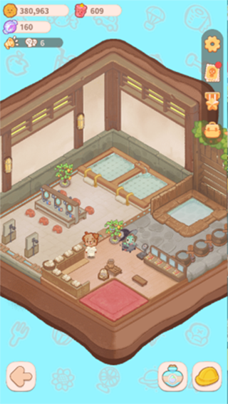 温泉:一些温泉有的日常设施,淋浴、温泉池、洗漱台、毛巾柜,一些设施具有耐久值属性,客人互动后会降低耐久值,玩家可点击补充。