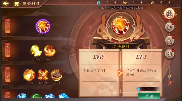 从技能介绍可以看出,对应的就是四大阵营不同科技的提升。每一阶开启也有不同的盟会等级要求,因此盟会等级越高,可选择的科技也就越多。因为科技升级需要消耗大量的科技点,因此建议在前期有选着性的选择对应的科技进行提升,最大程度的提升整体的实力。自己拥有哪些伙伴是选着科技点的关键,因此建议前期优先点自己使用较为频繁的伙伴,可以快速提升实力,方便获得更多的资源。
