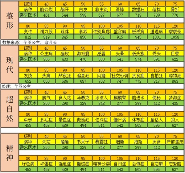 5、专科每5级增加一个新病人,每个级别新加病人以及所需医术如下: