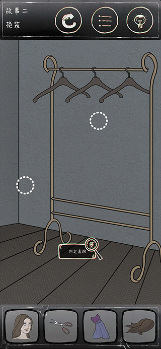 2.女主放左边,剪刀剪掉头发,衣服挂架子上,判定真相,获得成就,弄虚作假