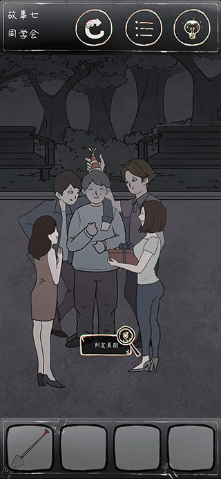 3.把所有道具如图摆放,再把铲子给胖子,判定真相,即可通关。