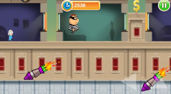 这款游戏叫《老爸曾是小偷3》,玩起来挺有意思的。主要是考验反应力的躲避跑酷游戏,你得控制主角爸爸用虚拟按键后退跳跃,避开导弹、飞碟啥的,后面还有警察追你,感觉特别紧张刺激。游戏里的人物设计得很萌,不管是警察还是主角爸爸都超可爱。背景音乐和节奏感也很棒,玩起来很带劲。