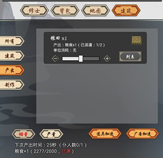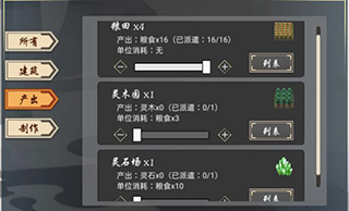 5、资源产出在建筑中,注意是否满仓,生成灵木灵石需要消耗粮食,所以优先提升粮田,仆从可在建筑-房舍中增加。