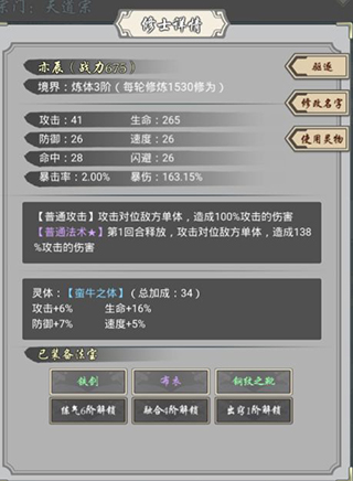 6、属性随机、多品质的法宝/灵体,搭配随机领悟的功法,可培养自己独特的修士。