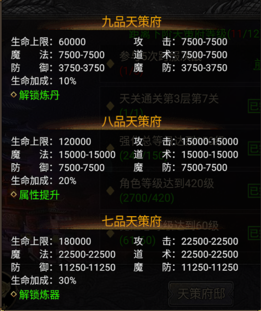 天策府是游戏内唯一长线的支线任务,也是独属的培养体系。天策府分一至九品;