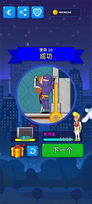 游戏还提供了多种间谍皮肤供玩家选择,比如杀马特、小丑等搞笑造型,让玩家可以根据自己的喜好个性化装扮角色。此外,游戏中还有金币收集系统,玩家可以通过完成关卡获得奖励,解锁更多有趣的皮肤和道具。