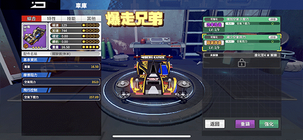 如果你的四驱车不断飞出赛道,在没有紫色以上的车壳时,请优先把蓝色车壳升级到最高,甚至可以考虑进化到一星,点出「增加空气下压力」的技能,可以大幅减少飞出赛到的机率。另外把你现有的龙头和凤尾都先装上去并予以升级。如果是马达速度太快,导致车速太快,请换个转速慢点的马达。
