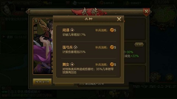推荐:强弓兵(貂蝉属于计策武将这个兵种大大增加了计策伤害)