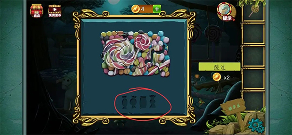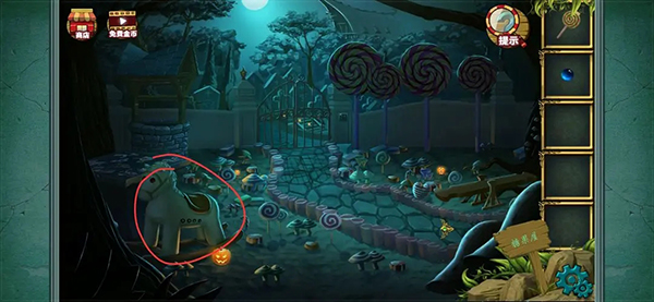 拼成这样就差不多了 完成后得到一把刀然后记住下方的糖果提示 之后会用到(小伙伴玩这种游戏的时候看到可疑的提示都可以注意下 后面都会用的到的 ) 然后点击台子上方的水井 可以看到一个颜色提示记下来 然后拾取水桶