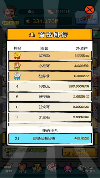 同时除了常规的经营玩法意外,游戏中还能对其他行业的大亨发起挑战,争夺项目逆袭人生,不断的突破你的极限,最终走向首富榜首,收购其他公司。
