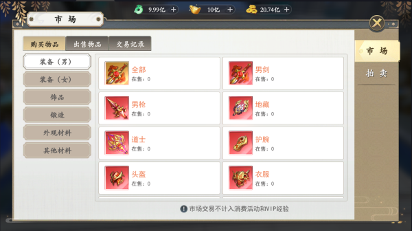 通过主界面的“市场”按钮就可进入到市场,可以看到市场交易系统页面,能交易的内容是琳琅满目,包罗万象,从各种武器装备,到稀有材料,从外观材料,到其他各项道具……可以说“市场”的可交易物品是应有尽有了!各位仙友想要交易的物品,在这里都可以自由的交易!