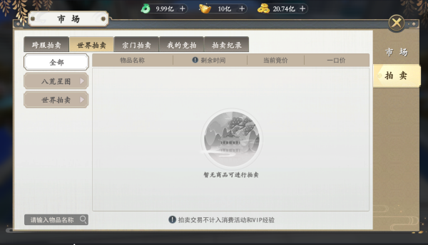 拍卖分为【跨服拍卖】【世界拍卖】【宗门拍卖】三部分,这里的道具主要为活动产出的珍稀道具,各位想提升战力的仙友们一定不能错过哦