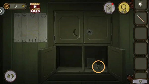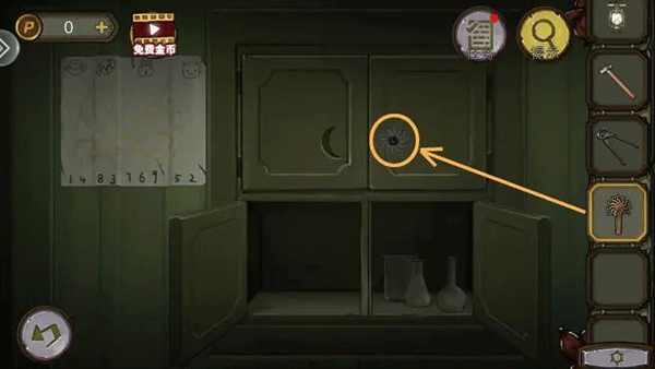 2、根据柜子旁的连线图,解开笼子的锁,拿到【手套】。解谜思路:连线图中,每个动物连接对应的数字。密码:3749