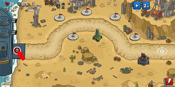 3、点击红色骷髅即可开启关卡,每波敌人出现前,可提前点击红色骷髅获取额外奖励金钱