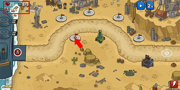 1、下载并打开蒸汽朋克防御进入游戏后,来到初始教程,首先如下图所示,圆盘中插着一根旗帜的位置可用于布置防御塔,防御塔布置所需资源为左上方齿轮图标后方数字