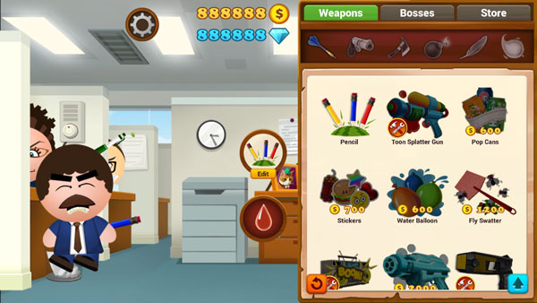 游戏为玩家们准备了多种多样的攻击武器,例如铅笔、水枪、大头针、飞镖、气枪等等,每一个都具有不同的杀伤力,玩家们可以用攻击老板获得的金币去解锁各种武器。游戏中繁多的武器会给玩家们更多的选择,而且随着攻击次数的增加,我们自身等级也会提升,攻击力也会增长,再配合上更高级的武器,对老板可以造成成吨的伤害。