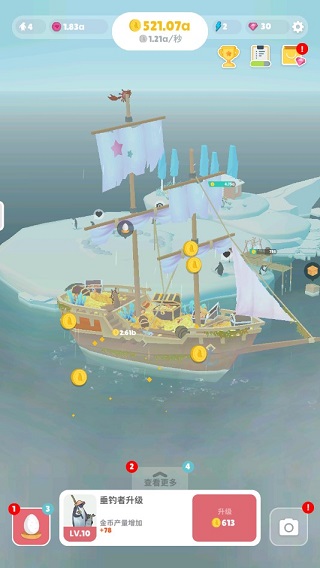 游戏的核心玩法围绕着资源管理和动物养成展开。金币和爱心是主要的循环资源,用于升级栖息地和购买企鹅;研究点则为特定功能服务。玩家需要通过合理分配资源,提升产出效率,解锁新建筑和生命体,比如兔子、海豹等,这些都能帮助玩家更快扩展岛屿。