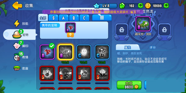 技能和宠物直接决定着英雄的战斗力,分为c~s级,通常越稀有的技能、宠物其碎片的获取难度越大。在集齐碎片后,玩家还需要消耗一定的金币进行合成。