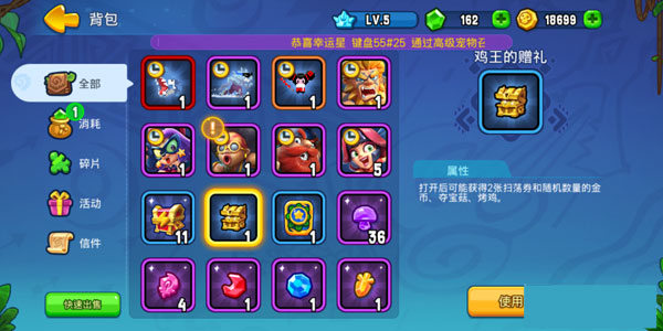 玩家在背包中可查看自己拥有的碎片、消耗等道具,其中的时效宠物以及时效英雄只能使用一定的时间,但仍旧可以进行英雄觉醒。等到下次使用该英雄后会继承上次的觉醒星级,因此玩家尽管放心培养自己心仪的英雄吧!