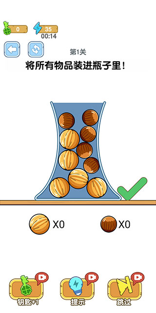 5、如果未能将所有物品装进瓶子里,使其凸出或者掉落就会失败。