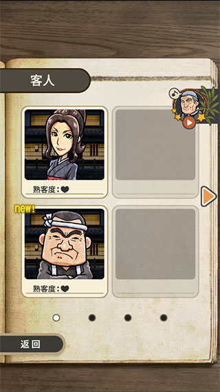 客人第一次出现会有一份简单的第一印象,出现后便可以在屏幕下的菜单里看到具体的资料,包括他们分别喜欢的关东煮、有什么样的心声(通过空缺可以把握角色进度)、常客度以及结局。