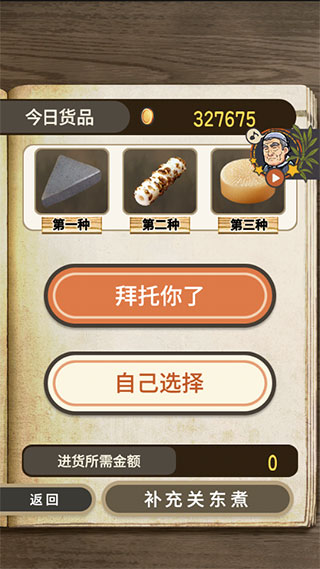 通过菜单的“进货”可以为小店进货。勾选所需要进的关东煮,点击“补充”即可。通过进货不同的关东煮可以控制来的客人是谁。