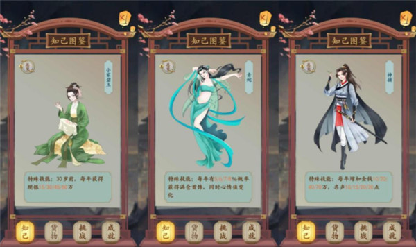 1、开局的时候我们有豆腐西施、采茶女以及小丫鬟3个知己可以选择,这里比较推荐优先考虑豆腐西施和采茶女,选择这两位可以提高游戏前中期的卖货收益。至于小丫鬟可以后面再娶,不过需要注意一下,想要娶小丫鬟,需要家中仅有一位伴侣,且没有家庭纷争。