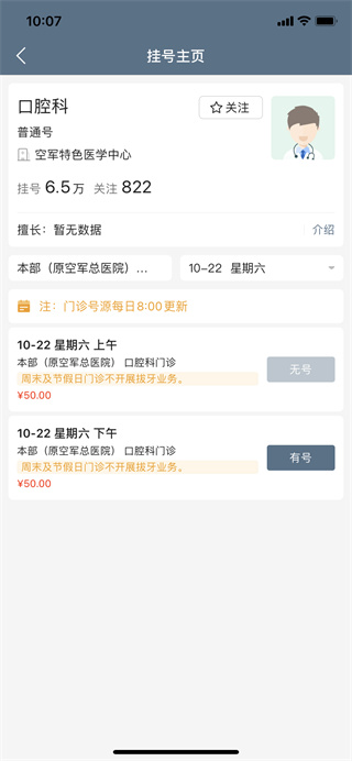 空军总医院是一款为空军总医院定制开发的智慧医院手机客户端,一般又称“空军特色医学中心”,为用户提供预约挂号、取报告单、智能导诊等服务,让患者可以直接通过手机预约挂号,免去排队困扰,享受更全面、更优质、更高效的医疗服务。软件使用简单,用户只需要通过手机号进行登录,然后再根据自己的病症选择对应的科室,最后在线挂号就行了。当然,如果你有心仪的专家,在这里也是可以自主选择的,不过需要注意的是每位专家的号都是有着数量限制的,所以手速一定要快哦。此外呢空军总医院app内还有着丰富的健康百科知识,以及各类健康头条资讯,健康的用户和患者都能在线学习与阅读,有需要的用户赶紧来下载吧!