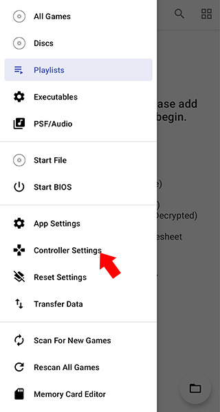 1、在本站下载安装并打开duckstation模拟器,使用手柄连接手机设备之后,点击左上方的三条杠按钮