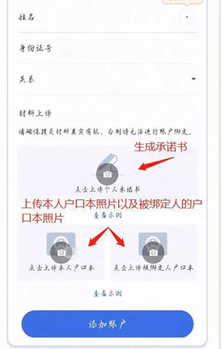 10、确认被绑定人员的身份信息和承诺书、户口本照片是否有误,无问题的话即可点击最下方“添加账户”;