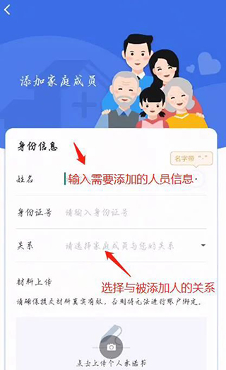 4、输入需要添加的人员信息,选择关系“父母、爱人、孩子、其他”;