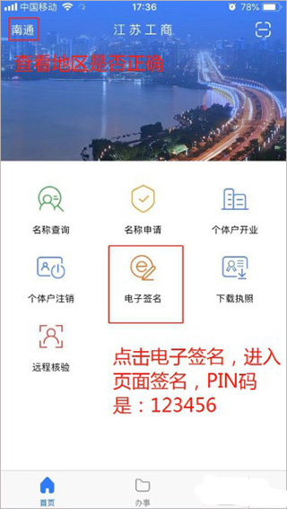 5、人脸识别完成后,我们查看首页左上角地区,是否是我们注册公司所在地区,如果不正确,点击切换地区。然后点击电子签名,进入签名页面,输入PIN码默认是123456