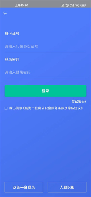 1、下载进入威海公积金app之后,先我们输入身份证号和密码完成账号的登录。