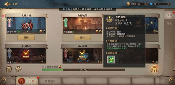 在前期的游戏中,主要升级手段不多,主要是恶魔广场,血色城堡和快速战斗。
