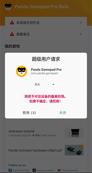 1、仅需手机获取Root权限之后,打开Panda Gamepad Pro并在弹窗中授予其Root权限