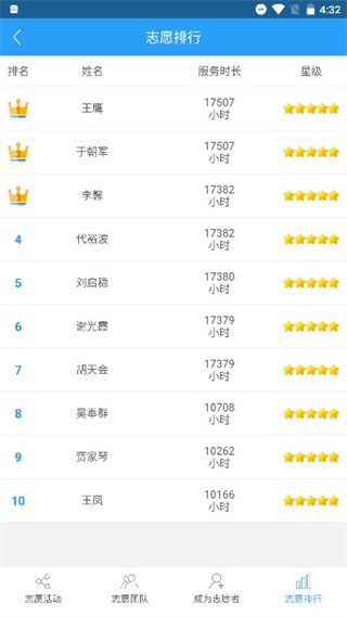 5、志愿排行这一栏还可以查看志愿者的排名,服务时长,星级。