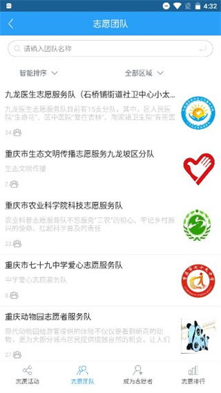4、点击进入志愿团队版块,就能搜索到各个地区的志愿服务队。