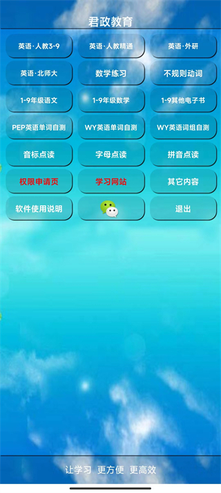 不管是哪一个方面的学习资料,在这里都能系统化的进行学习,而且里面的题库非常多,能够帮助你在这个阶段能够有相应的训练!为满足用户们的学习需求,君政教育app还提供了音标点读、字母点读、拼音点读以及wy英语词组自测等功能, 学生们可以在线点读英语课本上的单词、词汇、课文内容,而且这里还配备了教材上的课后习题功能,有效帮助学生提升学习成绩。有需要的朋友们快快前来下载体验一番!