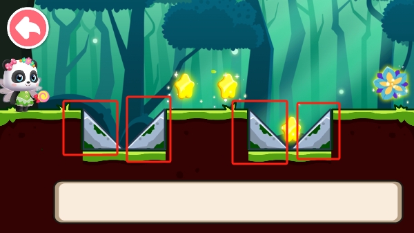前方道路太高,几何块不够用怎么办?别忘了有特殊装置:放上弹簧,一跃而上。咻,安全到达高处。如何运用道具,考验着宝宝的全局规划哦。