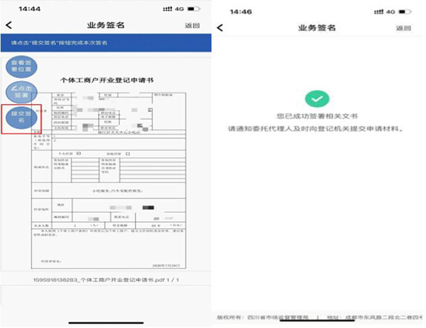 8、所有相关人员签名完成后,在个体开办页面“我的业务”中找到申请件,确认显示签名完毕后,点击“提交申请”,完成申办。