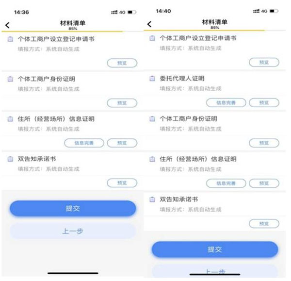 6、完善材料清单。若经办人与经营者为同一人(本人办理的),则只需完善“住所(经营场所)信息证明”,点击“信息完善”,通过下拉菜单选择“房屋证明材料类型”、“房屋用途”,上传照片后保存。若经办人与经营者不为同一人(委托代理人),除了完善“住所(经营场所)信息证明”,还需要完善“委托代理人证明”,点击“信息完善”,根据提示填写标红星空格后保存。完成上述步骤后,点击提交进入签名环节。