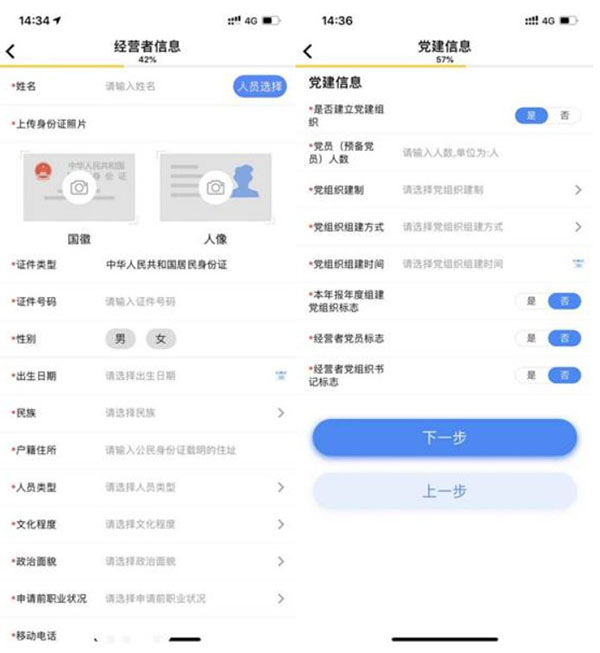 5、完善经营者信息、党建信息。经营者信息可以直接通过“人员选择”按键选择经办人为经营者,或通过从图片上传身份证照片或扫描身份证原件等形式导入经营者信息,填写标红星空格处之后进入下一步完善党建信息。党建信息默认为否,可直接点击进入下一步,若需要录入党建信息,则选择“是”,完善标红星空格后,点击进入下一步。