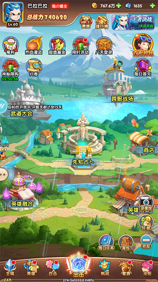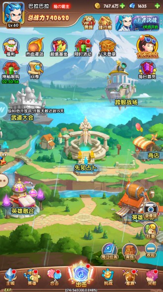《漫斗纪元》主城图上面一排是福利活动,中间的各个小屋是特定功能玩法,下面是个人养成和副本,简单明了。