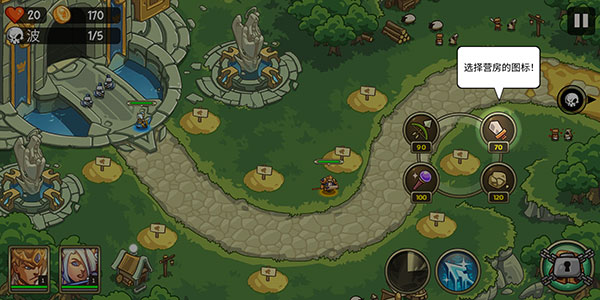 在进入战斗时我们三位英雄边上的土包就是我们需要建造防御塔的地方了,只需要点击土包然后选择防御塔的类型点击对号就可以创建成功,如果金币足够多的话是可以升级你的防御塔的等级越高攻击伤害越大。如果金币不多的话那么优先升级在路口前端最先和敌人战斗的防御塔。