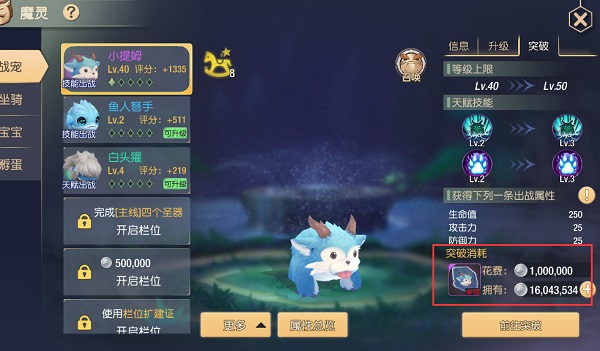 当你的魔灵升级到一定阶段的时候,需要消耗对应魔灵碎片进行突破,才能继续升级。
