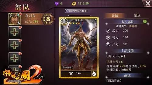 从真·吕布进阶成鬼·吕布后,武力、智力、兵力再次大幅度提升,主动技能鬼·天下无双提升自身225%物理攻击、50%物理防御。